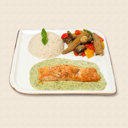 سلمون بصوص السبانخ والكريمه يقدم مع الارز الابيض وخضار سوتيه